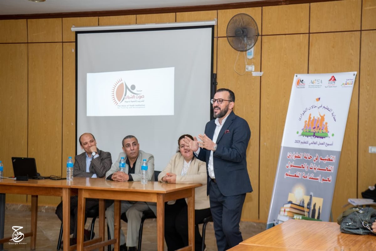 نظمت مؤسسة صوت الشباب للتدريب والتنمية بأسيوط عضو الإتحاد المصري للسياسات والبحوث التربوية؛ ندوة بعنوان "التعليم في حالات الطوارئ: التحديات والحلول نحو استدامة التعلم" بالتعاون مع الحملة العالمية للتعليم، والحملة العربية للتعليم للجميع "اكيا" بقاعة مركز تدريب النيل التابع لمديرية الصحة وذلك في إطار تنفيذ فعاليات الأسبوع العالمي للتعليم.
