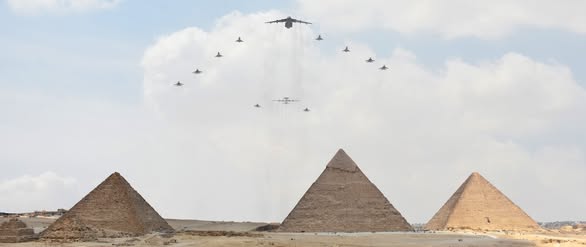 فى الجو، كما نفذت مجموعة من المقاتلات المشاركة بالتدريب تشكيلاً جوياً فوق الأهرامات أبرز الدقة والكفاءة التى يتمتع بها الطيارون من كلا الجانبين.