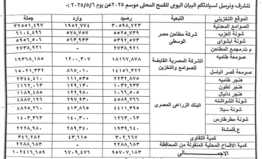 وكانت صوامع الغلال قد بدأت استلام محصول القمح من المزارعين منذ بداية شهر أبريل الماضي، بعدد من الشون والصوامع والهناجر المجهزة لاستقبال المحصول بالقرى والمراكز.