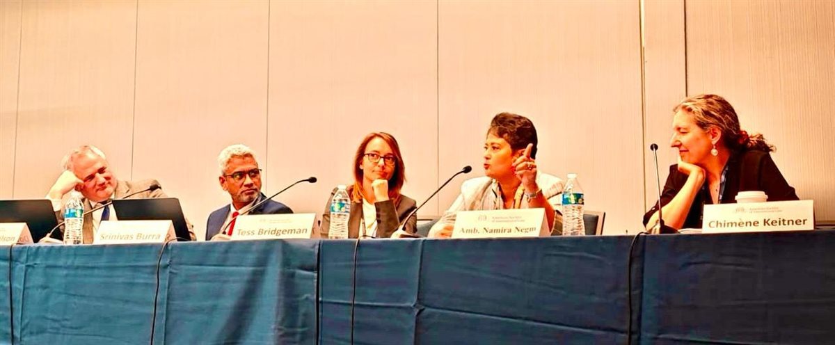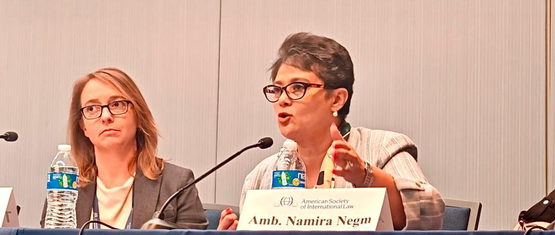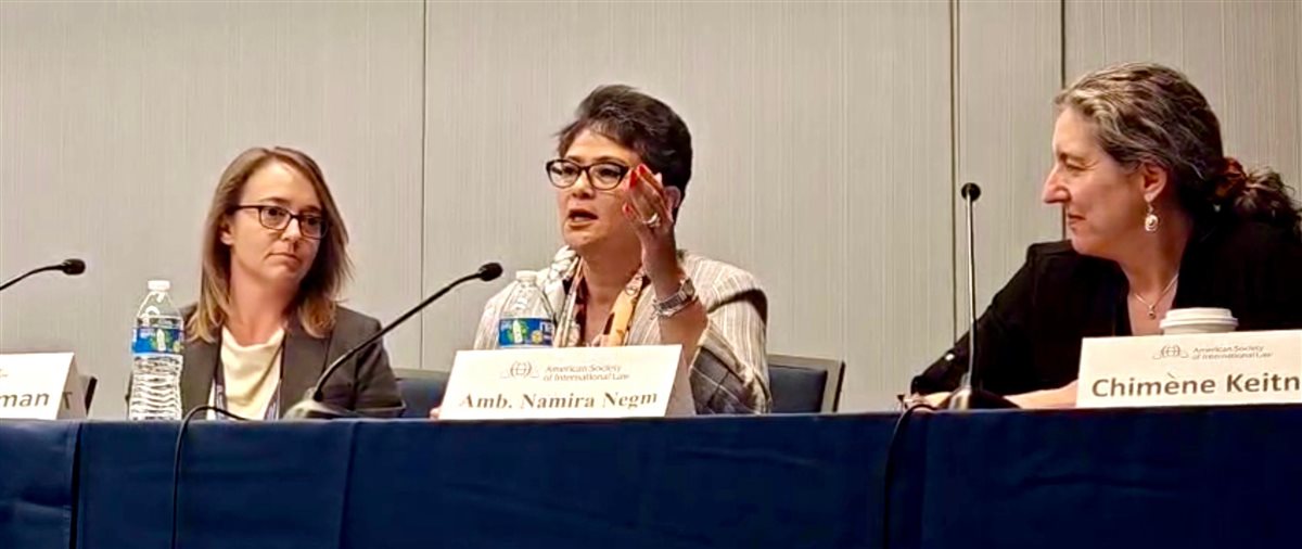 جاء ذلك أثناء الحلقة النقاشية التي جاءت تحت عنوان "حق اللجوء إلى الحرب (Jus ad Bellum)" ضمن فعاليات المؤتمر السنوي للجمعية الأمريكية للقانون الدولي (ASIL) في دورته الـ 119، والذي انعقد في العاصمة الأمريكية واشنطن.