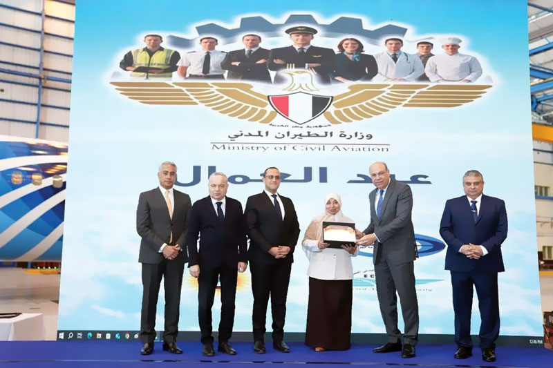 فى احتفالية نظمتها وزارة الطيران المدنى بمناسبة عيد العمال بهنجر ٧٠٠٠ التابع لشركة مصر للطيران للصيانة والأعمال الفنية، قام الدكتور سامح الحفنى وزير الطيران المدنى بتكريم عدد من النماذج المتميزة فى مختلف مواقع العمل، تقديراً لإخلاصهم وتفانيهم ودورهم فى دفع مسيرة التنمية والتطوير بقطاع الطيران المدنى، وذلك بحضور حسن شحاتة وزير العمل السابق ورئيس النقابة العامة للنقل الجوى والطيار منتصر مناع نائب وزير الطيران المدنى والطيار عمرو الشرقاوى رئيس سلطة الطيران المدنى، والطيار أحمد عادل رئيس مجلس إدارة الشركة القابضة لمصر للطيران، والمهندس أيمن فوزى عرب رئيس الشركة القابضة للمطارات والملاحة الجوية، والطيار عزت متولى رئيس الأكاديمية المصرية لعلوم الطيران، والملاح هشام طاحون رئيس الهيئة العامة للأرصاد الجوية، ورؤساء مجالس إدارة الشركات التابعة، ولفيف من قيادات الوزارة والعاملين.