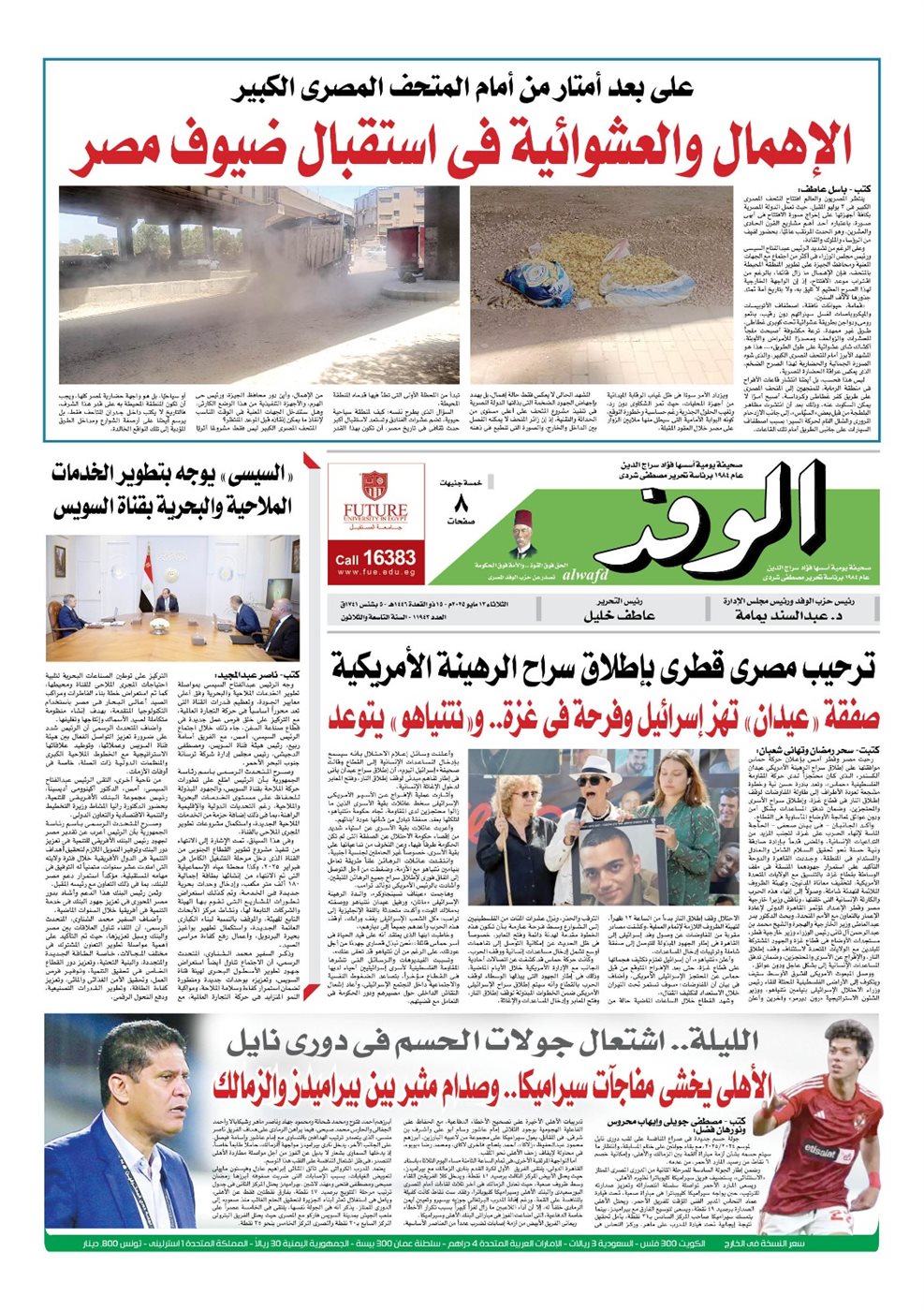 تنشر جريدة الوفد في عددها الصادر، غدًا الثلاثاء، العديد من الموضوعات والتقارير الإخبارية المهمة، أبرزها: على بعد أمتار من أمام المتحف المصرى الكبير.. الإهمال والعشوائية فى استقبال ضيوف مصر.