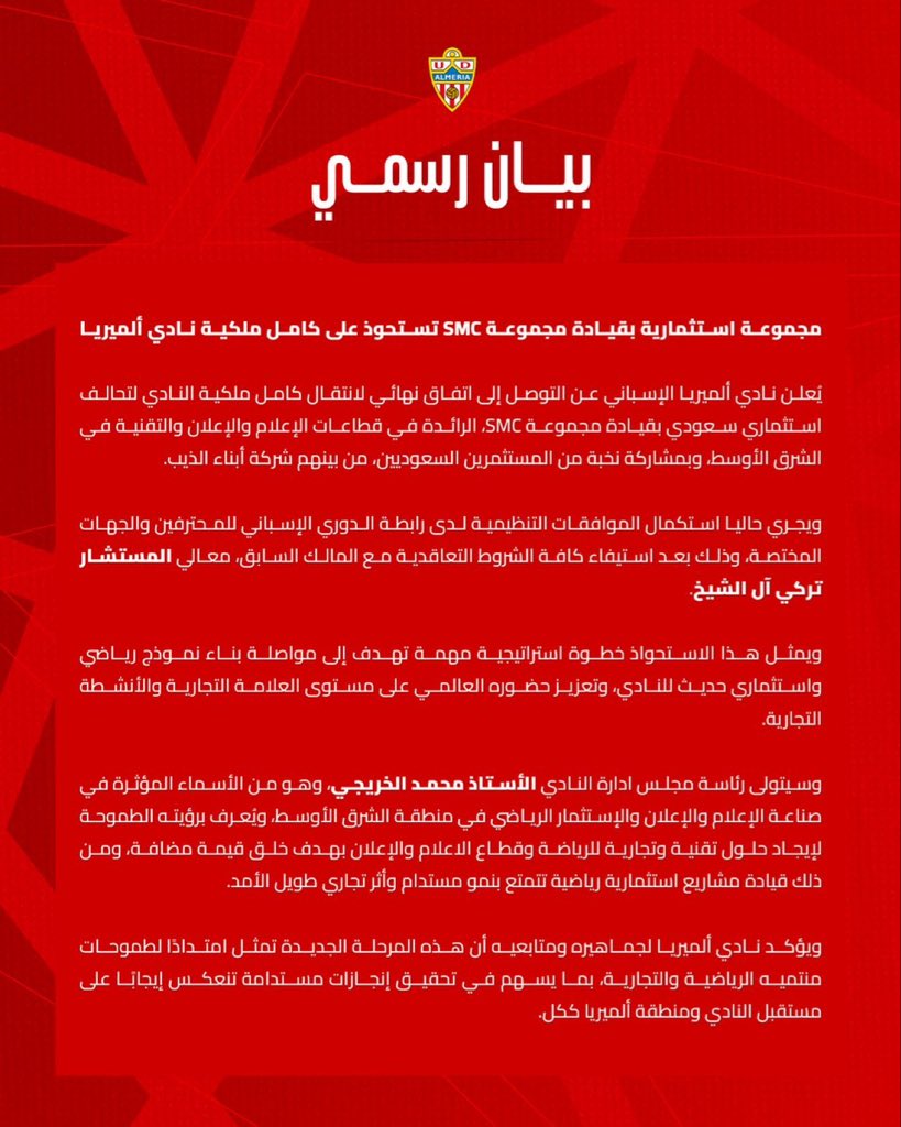 أعلن نادي ألميريا الإسباني التوصل إلى اتفاق نهائي يقضي بانتقال كامل ملكية النادي إلى تحالف استثماري سعودي تقوده مجموعة "اس ام سي".