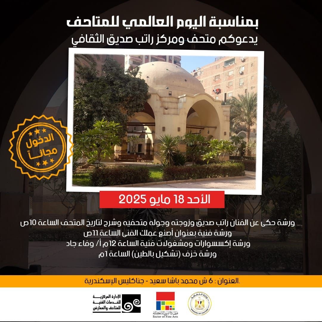أما متحف ومركز راتب صديق الثقافي، فينظم سلسلة من الفعاليات تبدأ بورشة حكي وجولة تعريفية بتاريخ الفنان وزوجته الساعة 10 صباحًا، ثم ورشة “اصنع عملك الفني” في الحادية عشرة، تعقبها ورشة إكسسوارات في الثانية عشرة ظهرًا، وتُختتم اليوم بورشة خزف (تشكيل بالطين) في الساعة 1 ظهرًا.