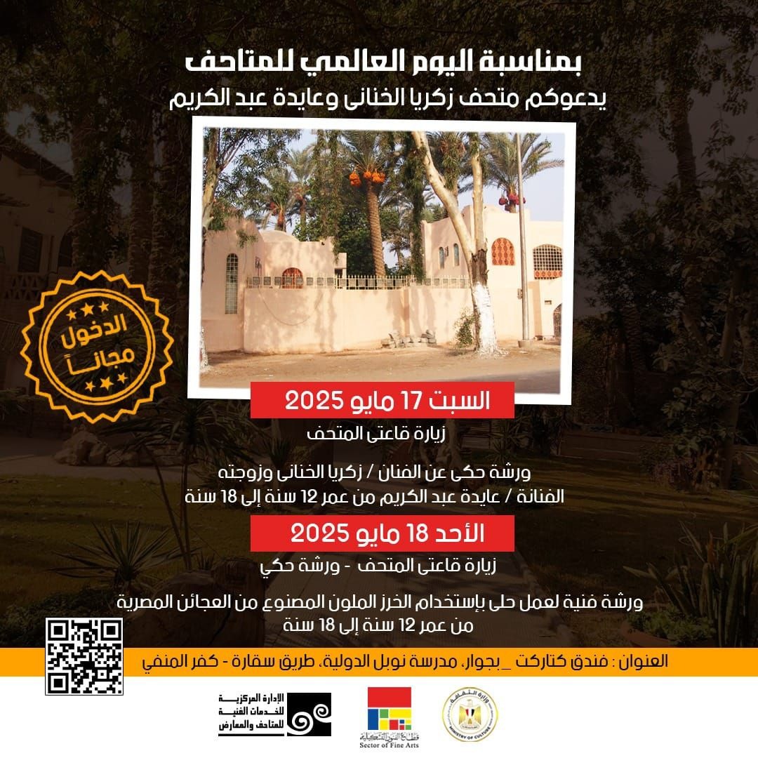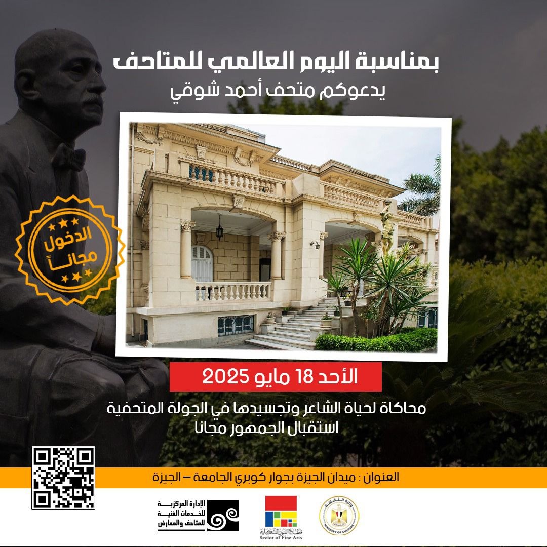 وفي متحف طه حسين، يُفتتح معرض بعنوان “طه حسين في عيون الذكاء الاصطناعي”، يعقبه حفل غنائي وورشة لفريق “نور الحياة” من ذوي الهمم. بينما يستضيف متحف الأبنودي للسيرة الهلالية ورشة حكي بعنوان “كنوز متاحفنا”، تهدف إلى تعريف الزوار بمقتنيات متاحف قطاع الفنون التشكيلية. وفي متحف أحمد شوقي، تُقدم جولة محاكاة حية لحياة الشاعر تتجسّد خلالها ملامح من سيرته داخل المتحف، كما يُقام في متحف المنصورة القومي بدار بن لقمان ورشة فنية بالتعاون مع نقابة التشكيليين بالدقهلية، يعقبها محاضرة بعنوان “أهمية المتاحف في حفظ التراث والثقافة”.