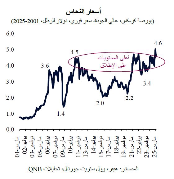تجاوزت أسعار النحاس بشكل كبير نطاق تداولها التاريخي، حيث تبلغ الآن حوالي 4.6 دولار أمريكي للرطل، وهي قفزة واضحة تتجاوز الذروات السابقة التي شوهدت بعد الأزمة المالية العالمية وأثناء طفرة الاستثمار في مرحلة ما بعد جائحة كوفيد.