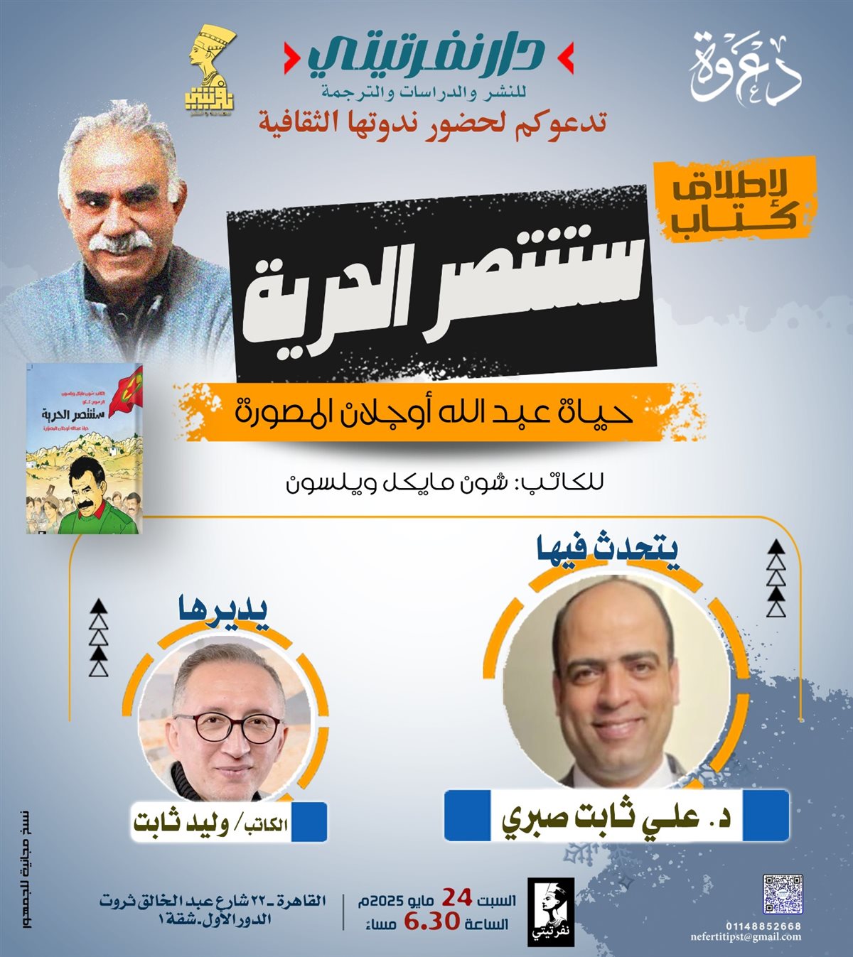 تقيم دار نفرتيتي للنشر والدراسات والترجمة مساء اليوم السبت ندوة فكرية وحوارية بمناسبة انطلاق الترجمة العربية لكتاب (ستنتصر الحرية: حياة عبدالله أوجلان المصورة)، للكاتب/ شون مايكل ويلسون.. يتحدث فيها الدكتور/ علي ثابت صبري، أستاذ التاريخ بكلية الآداب جامعة دمنهور، ويديرها الكاتب/ وليد ثابت، وذلك في إطار الفعاليات الثقافية للدار.