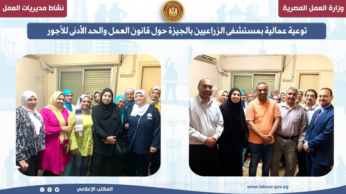 نظمت مديرية العمل بمحافظة الجيزة، ندوة توعوية بمستشفى الزراعيين بالدقي، بعنوان "حقوق وواجبات العمال في قانون العمل وتطبيق الحد الأدنى للأجور"، بحضور 30 عاملًا من العاملين بالمستشفى، وذلك من خلال مكتب عمل وسط الجيزة، في إطار حرص المديرية على نشر الوعي القانوني داخل مواقع العمل.