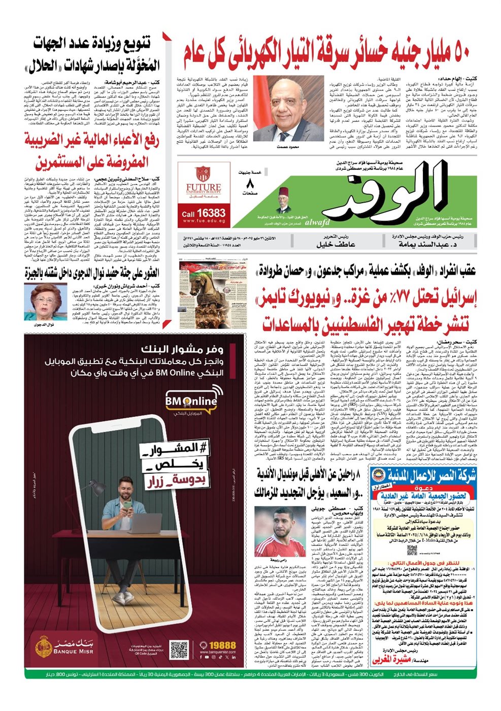 تنشر جريدة الوفد في عددها الصادر، غدًا الإثنين، العديد من الموضوعات والتقارير الإخبارية المهمة، أبرزها: “50 مليار جنيه خسائر سرقة التيار الكهربائي كل عام”