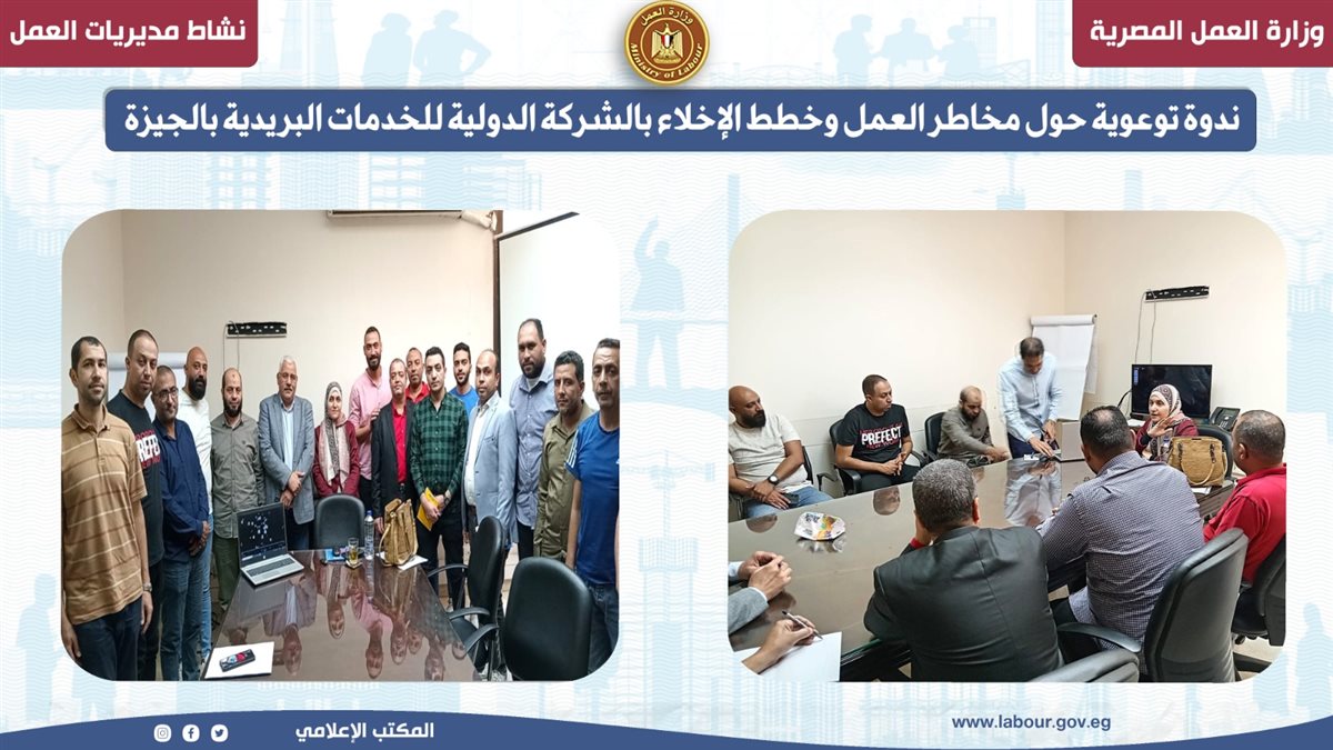 نظمت مديرية العمل بمحافظة الجيزة، من خلال مكتب السلامة والصحة المهنية بمنطقة وسط الجيزة، ندوة للتوعية بعنوان "التعريف بمخاطر العمل وخطط الطوارئ والإخلاء" بالشركة الدولية للخدمات البريدية، بحضور 22 عاملاً، وذلك تحت رعاية وزير العمل محمد جبران، وبإشراف الإدارة المركزية للسلامة والصحة المهنية.
