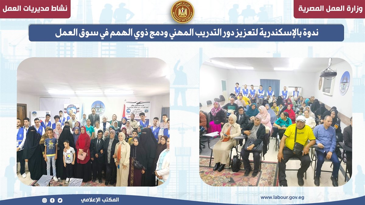 كما نظمت مديرية العمل بالإسكندرية ندوة تثقيفية حول أنشطة التدريب المهني ودور المديرية في دعم وتمكين ذوي الهمم، وذلك بمقر المديرية وفي إطار تنفيذ توجيهات محمد جبران وزير العمل بالاهتمام بالمشاركة المجتمعية وملف ذوي الهمم.