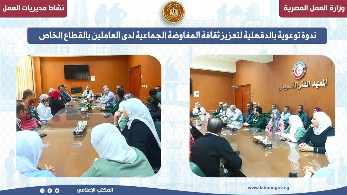 وعقدت مديرية العمل بالدقهلية من خلال مكتب عمل شربين، ندوة توعوية حول المفاوضة الجماعية، استهدفت العاملين بالمعهد العالي التكنولوجي والمعهد الفني للتمريض بشربين، وذلك في إطار توجيهات الوزير محمد جبران وزير العمل، بضرورة رفع وعي العاملين بحقوقهم وواجباتهم وتعزيز ثقافة التسوية الودية بين طرفي علاقة العمل.