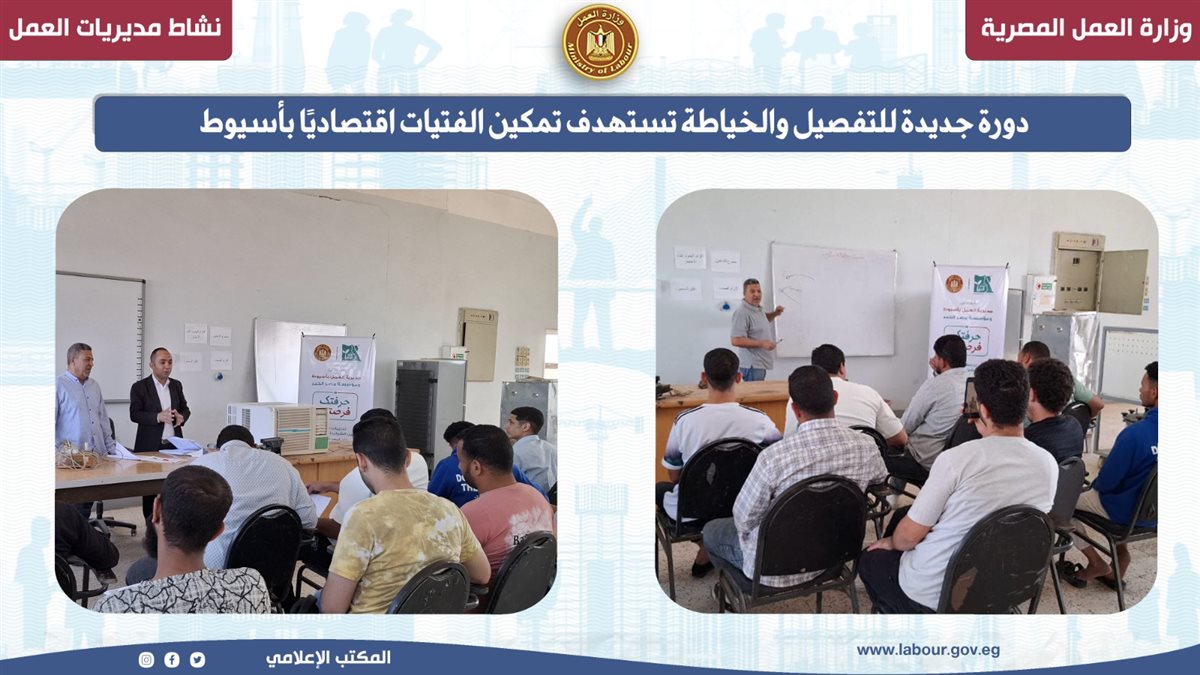 أعلنت مديرية العمل بمحافظة أسيوط، انطلاق فعاليات دورة التفصيل والخياطة بوحدة التدريب المتنقلة بمنطقة عمل أسيوط، والتي تستهدف تدريب 16 فتاة، في إطار حرص الوزارة على دعم الفئات الأولى بالرعاية وتمكينهن اقتصاديًا.