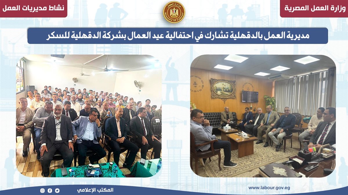 شاركت مديرية العمل بالدقهلية، في احتفالية عيد العمال التي نظمتها شركة الدقهلية للسكر بمقر الشركة بمركز بلقاس، والتي تضمنت تكريم عدد من العمال المتميزين، والعاملين الذين بلغوا سن التقاعد، وأبناء العاملين المتفوقين، وحفَظة القرآن الكريم، وذلك في إطار تعليمات محمد جبران وزير العمل بضرورة تعزيز الوعي العمالي ونشر ثقافة حقوق وواجبات العاملين، خاصة فيما يتعلق بمستجدات قانون العمل الجديد رقم 24 لسنة 2025.