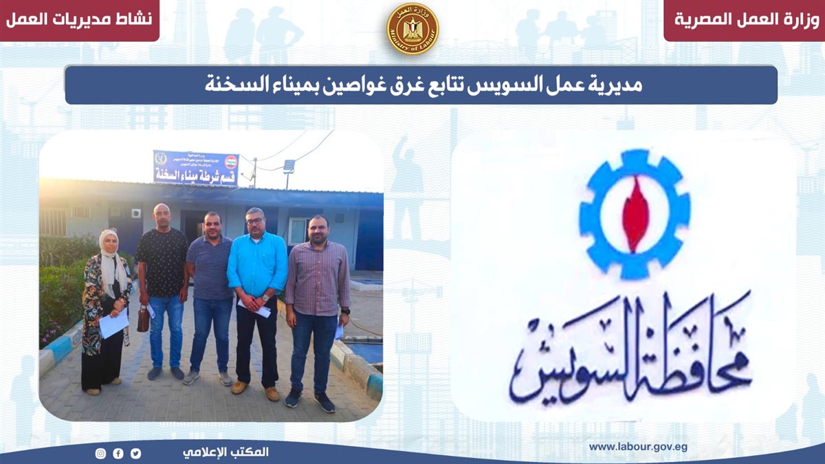وقامت مديرية العمل بالسويس، تحت إشراف هند جمال مدير المديرية، بالمشاركة في لجنة معاينة حادث غرق اثنين من الغواصين التابعين لشركة أوتو مارين بالإسكندرية، وذلك بموقع ميناء السخنة – الحوض الأول، رصيف رقم 2، تنفيذًا لتكليف النيابة العامة وقسم شرطة عتاقة.
