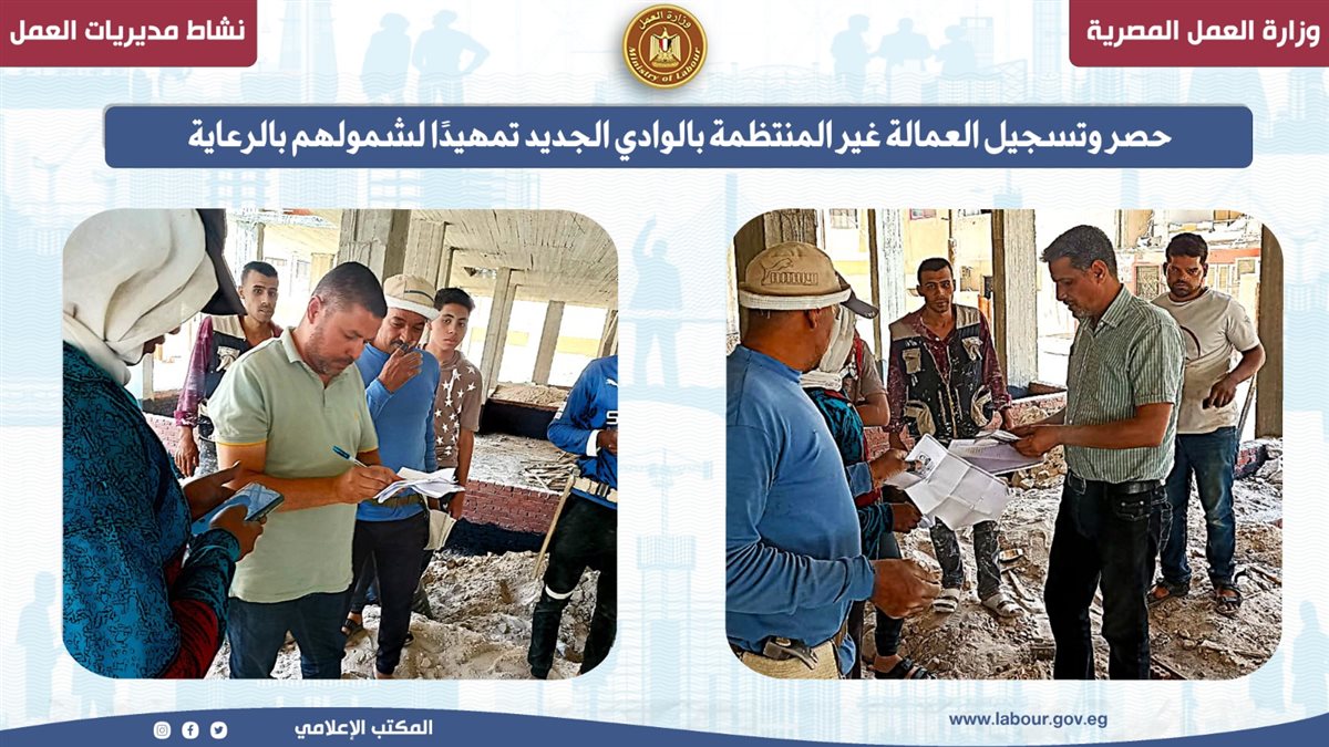 وقال أحمد طليب، مدير مديرية العمل بالوادي الجديد، إن هذه الجهود تأتي في إطار حرص وزارة العمل بالاهتمام بحصر وتسجيل العمالة غير المنتظمة في جميع مواقع العمل، وضمان حياة آمنة وكريمة لجميع المواطنين، وخاصة العمالة غير المنتظمة، وذلك تحت إشراف الإدارة المركزية للعمالة غير المنتظمة بالوزارة، وبالتنسيق مع أجهزة المحافظة.