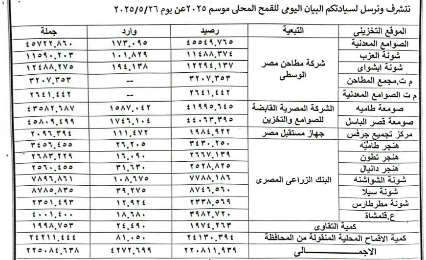 وكانت صوامع الغلال قد بدأت استلام محصول القمح من المزارعين منذ بداية شهر أبريل الماضي، بعدد من الشون والصوامع والهناجر المجهزة لاستقبال المحصول بالقرى والمراكز.