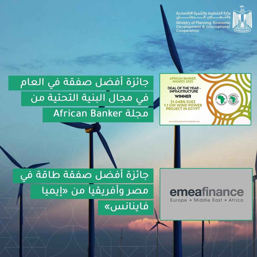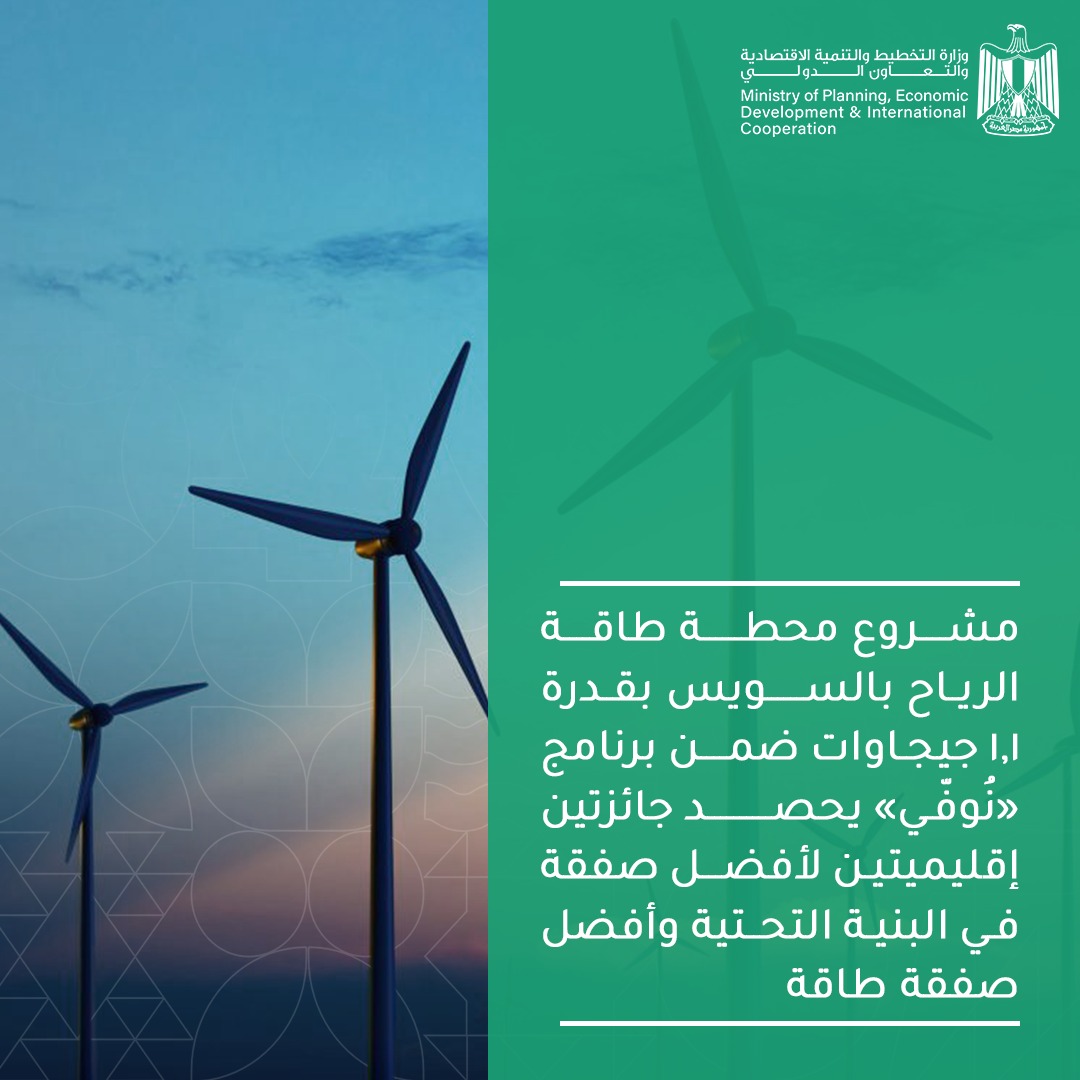 أعلنت وزارة التخطيط والتنمية الاقتصادية والتعاون الدولي، حصول مشروع محطة طاقة الرياح بالسويس بقدرة 1.1 جيجاوات، الذي ينفذه تحالف من القطاع الخاص المحلي والأجنبي، ضمن محور الطاقة بالمنصة الوطنية لبرنامج «نُوفّي»، على جائزتين دوليتين.