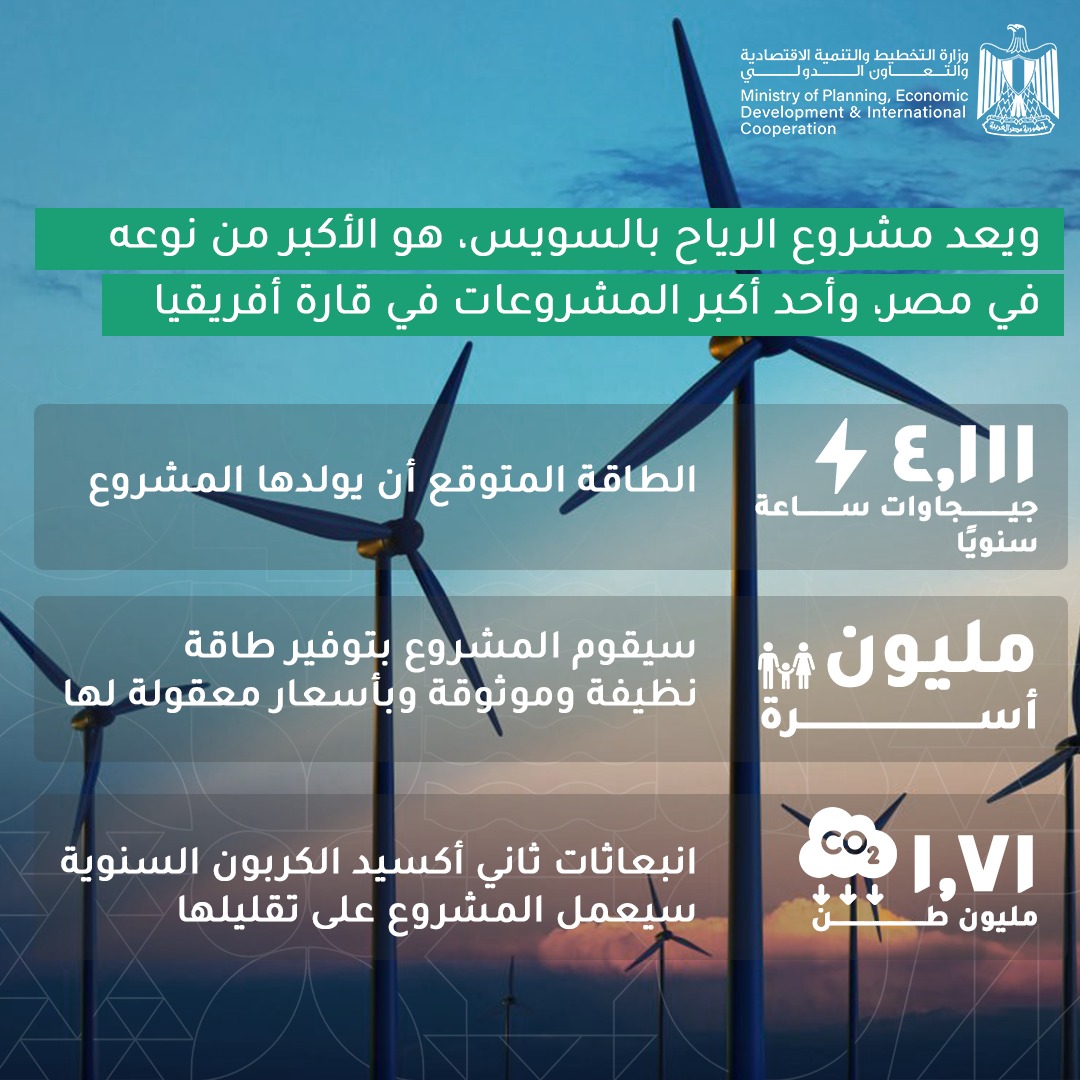 ويعد مشروع الرياح بالسويس، هو الأكبر من نوعه في مصر، وأحد أكبر المشروعات في قارة أفريقيا، ومن المتوقع أن يولّد 4111 جيجاوات ساعة سنويًا، ويوفر طاقة نظيفة وموثوقة وبأسعار معقولة لأكثر من مليون أسرة. وسيعمل على تقليل انبعاثات ثاني أكسيد الكربون السنوية بنحو 1.71 مليون طن، مما يسهم بشكل كبير في التزامات مصر المناخية بموجب اتفاقية باريس للمناخ.