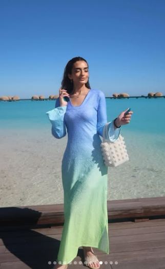 وبدت ملك أحمد زاهر بإطلالة صيفية مستوحاه من سحر الطبيعة الخلابة، مرتدية فستان طويل مجسم باكمام طويلة صمم من قماش ناعم بالألوان السماء وأمواج البحر.