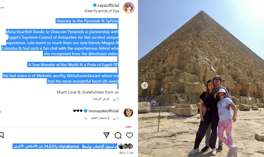 وتابعت: "شكرًا جزيلًا لشركة أوراسكوم بيراميدز، بالشراكة مع المجلس الأعلى للآثار في مصر، على هذه التجربة الفريدة والمُنسقة. تعلمت لولا الكثير من أصدقائنا الجدد ماجد وكولومبا، واستمتعت كثيرًا".