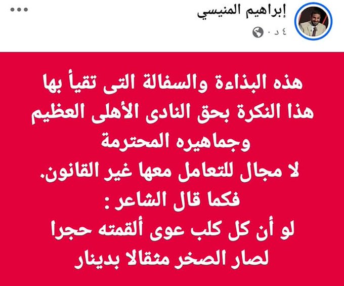 وكتب إبراهيم المنيسي، مقدم برنامج ملك وكتابة على قناة النادي الأهلي، عبر صفحته على موقع التواصل الاجتماعي فيس بوك، قائلًا: هذه البذاءة والسفالة التى تقيأ بها هذا النكرة بحق النادى الأهلى العظيم وجماهيره المحترمة.