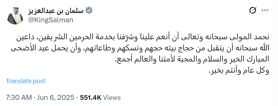 وقال العاهل السعودي عبر حسابه الرسمي بموقع التواصل الاجتماعي “إكس” تويتر سابقًا:"نحمد المولى سبحانه وتعالى أن أنعم علينا وشرّفنا بخدمة الحرمين الشريفين"، ودعا الله سبحانه وتعالى أن يتقبل من حجاج بيته حجهم ونسكهم وطاعاتهم.