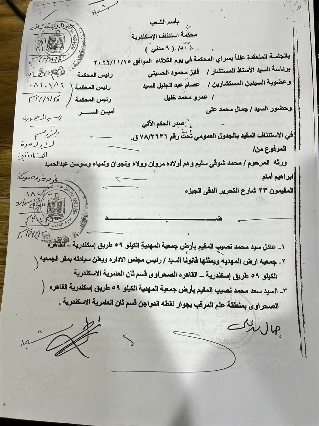 وكانت محكمة استئناف الإسكندرية قد أصدرت حكمًا نهائيًا برقم 3636/78ق لصالح الورثة ضد المدعو عادل سيد محمد نصيب، يُلزم برد الأرض لأصحابها الشرعيين، إلا أن الحكم لم يُنفذ حتى الآن دون وجود مبررات واضحة، ما يثير علامات استفهام كبيرة حول أسباب التأخير.