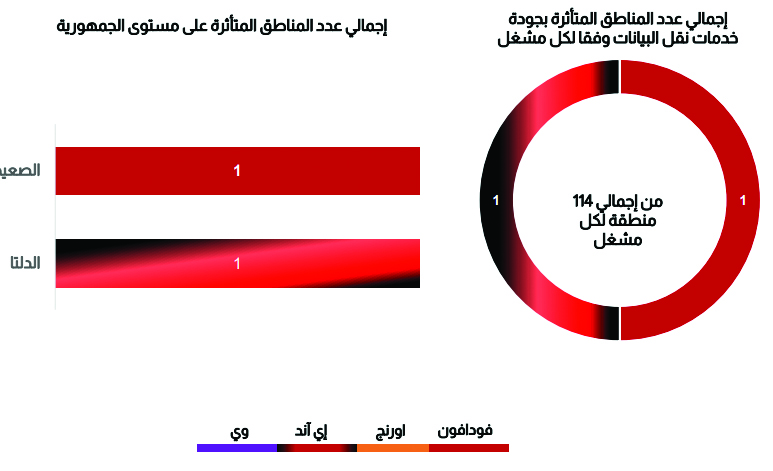 أما فى خدمات نقل البيانات، فكان التفوق من نصيب «وي»، التى سجلت أعلى متوسط سرعة تنزيل بلغ 90 ميجابت/ثانية فى مارس، صاعدة من 83 ميجابت/ثانية فى يناير، دون تسجيل أى منطقة متأثرة، وتبعتها فودافون (60 ميجابت/ثانية)، إى آند (60 ميجابت/ثانية)، ثم أورنج (50 ميجابت/ثانية).