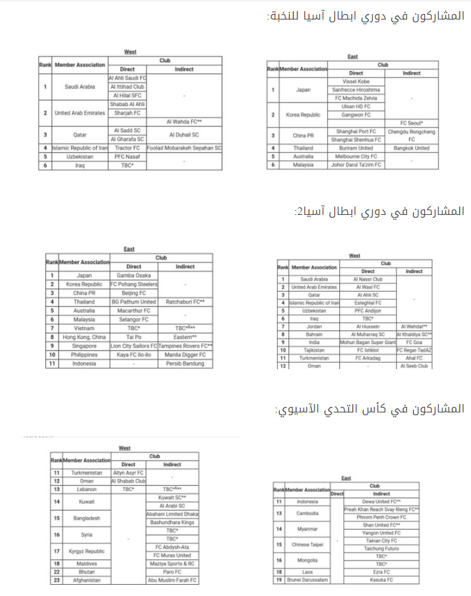 أعلن الاتحاد الآسيوي لكرة القدم قوائم الأندية المشاركة في بطولاته الثلاث للأندية للرجال لموسم 2025-2026، والتي تشمل دوري أبطال آسيا النخبة، ودوري أبطال آسيا 2، ودوري التحدي الآسيوي، وذلك وفقًا لتوزيع المقاعد النهائي واعتماد الأندية المرخصة.