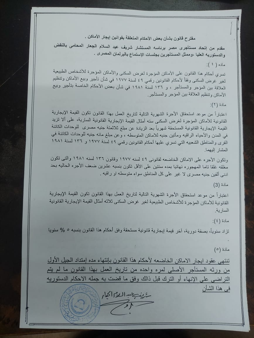 تقدم اتحاد مستأجري مصر، برئاسة شريف الجعار، المحامي بالنقض والدستورية العليا، وممثل المستأجرين في جلسات الاستماع بمجلس النواب، بمقترح قانون لتنظيم العلاقة بين المالك والمستأجر بشأن قانون الإيجار القديم.