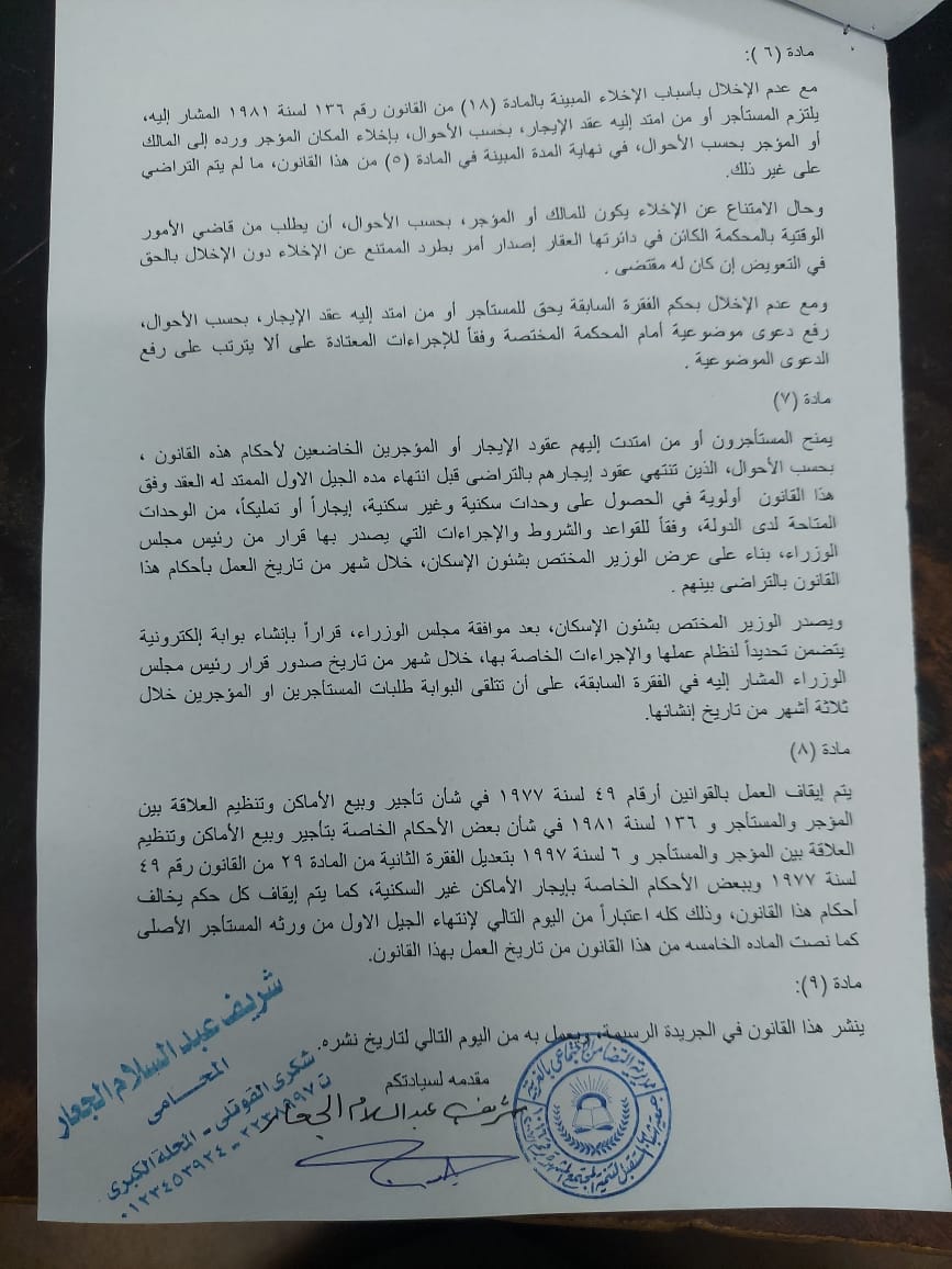 اعتبارًا من تاريخ استحقاق الأجرة الشهرية التالية لسريان هذا القانون، تكون القيمة الإيجارية القانونية للأماكن المؤجرة للأشخاص الطبيعيين لغير غرض السكن ثلاثة أضعاف القيمة الإيجارية القانونية السارية.