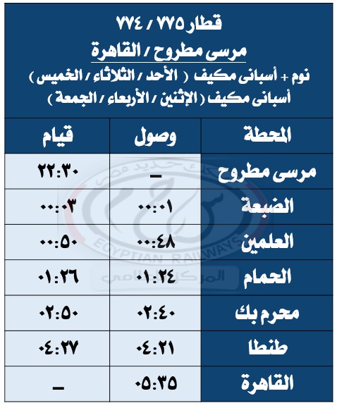 واعتبارًا من يوم الأحد الموافق 22 / 6 / 2025 يتم تشغيل قطار 775 / 774 (نوم + تانية أسبانى مكيف) مرسى مطروح / القاهرة أيام ( الأحد / الثلاثاء / الخميس ) من كل أسبوع لحين صدور تعليمات أخرى حيث يقوم من محطة مرسى مطروح الساعة 22:30 ويصل محطة القاهرة الساعة 05:35 صباح اليوم التالى طبقًا للجدول المرفق.