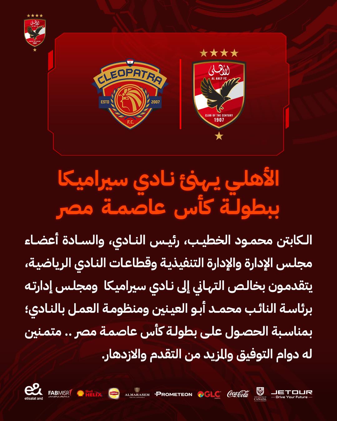 يتقدم محمود الخطيب، رئيس النادي الاهلي، والسادة أعضاء مجلس الإدارة والإدارة التنفيذية وقطاعات النادي الرياضية، بخالص التهاني إلى نادي سيراميكا ومجلس إدارته برئاسة النائب محمد أبو العينين ومنظومة العمل بالنادي؛ بمناسبة الحصول على بطولة كأس عاصمة مصر، متمنين له دوام التوفيق والمزيد من التقدم والازدهار.