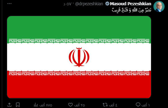 ونشر بزشكيان عبر حسابه على موقع إكس (تويتر) صورة للعلم الإيراني، وأرفقها بالآية القرآنية الكريمة :"نصر من الله وفتح قريب".