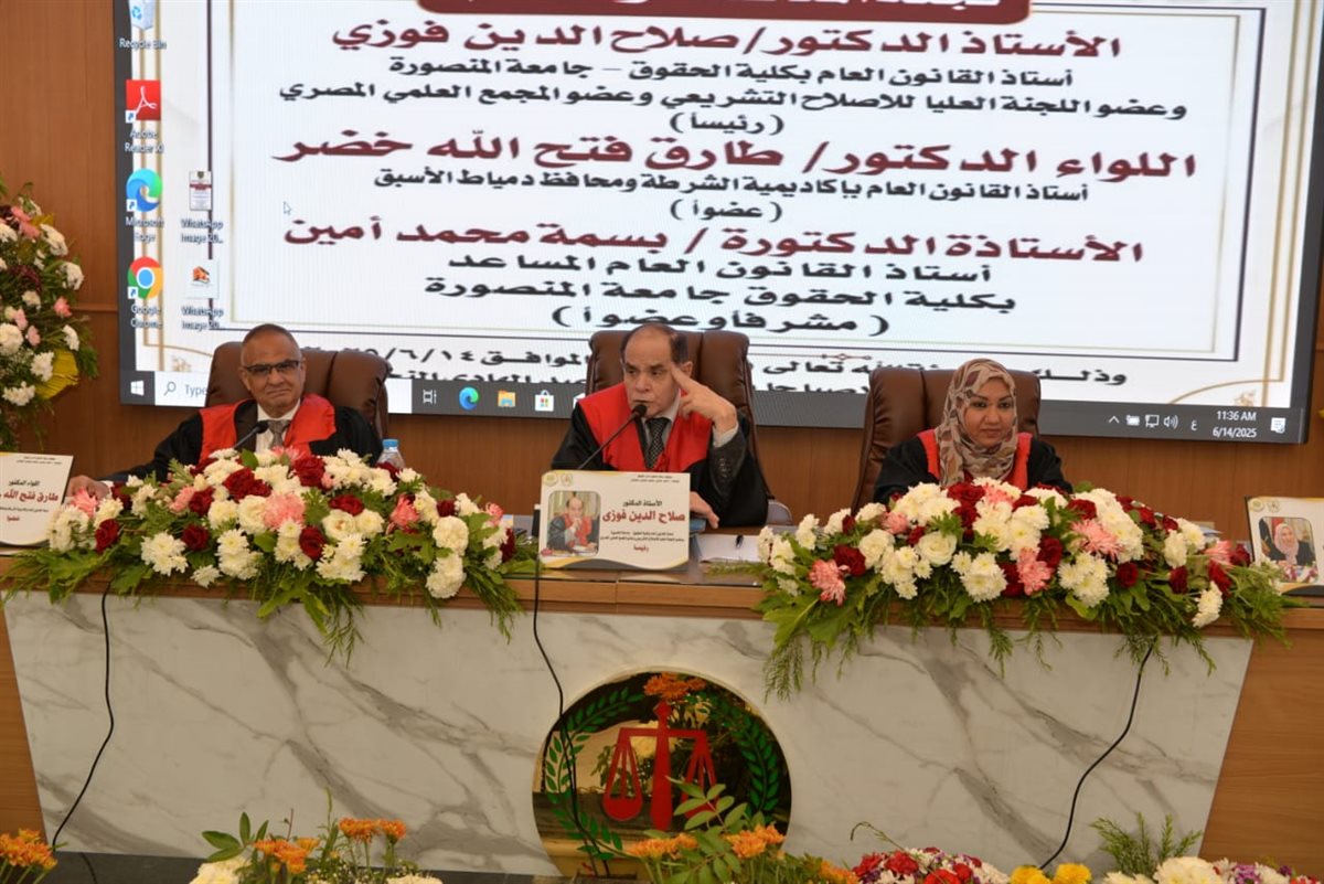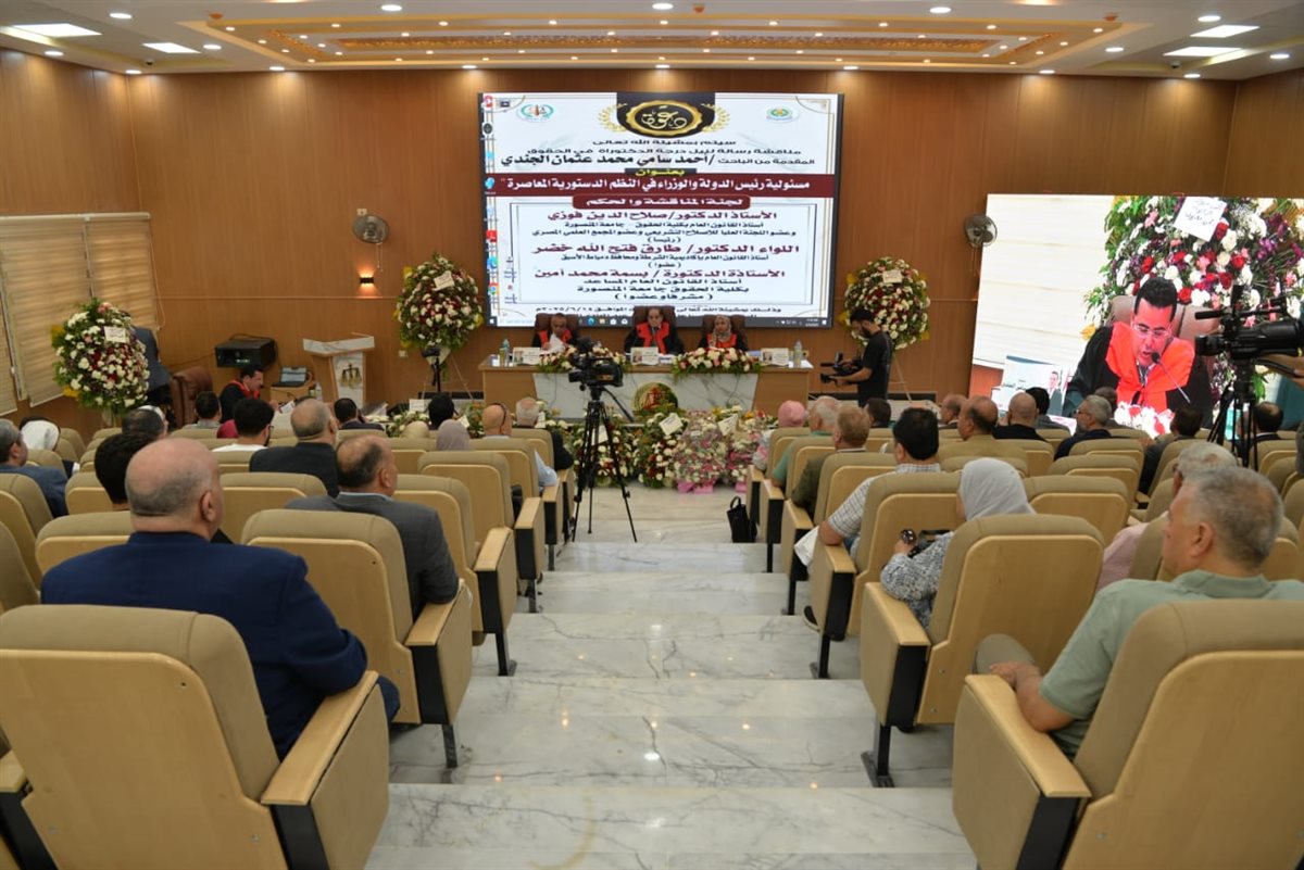 وحضر المناقشة الدكتور وليد الشناوي، عميد كلية الحقوق، والسادة وكلاء كلية الحقوق، والنائب طارق عبد الهادي، عضو مجلس النواب، و حازم نصر، رئيس اللجنة النقابية للصحفيين بالدقهلية، إلى جانب عدد من القيادات القضائية والأمنية.