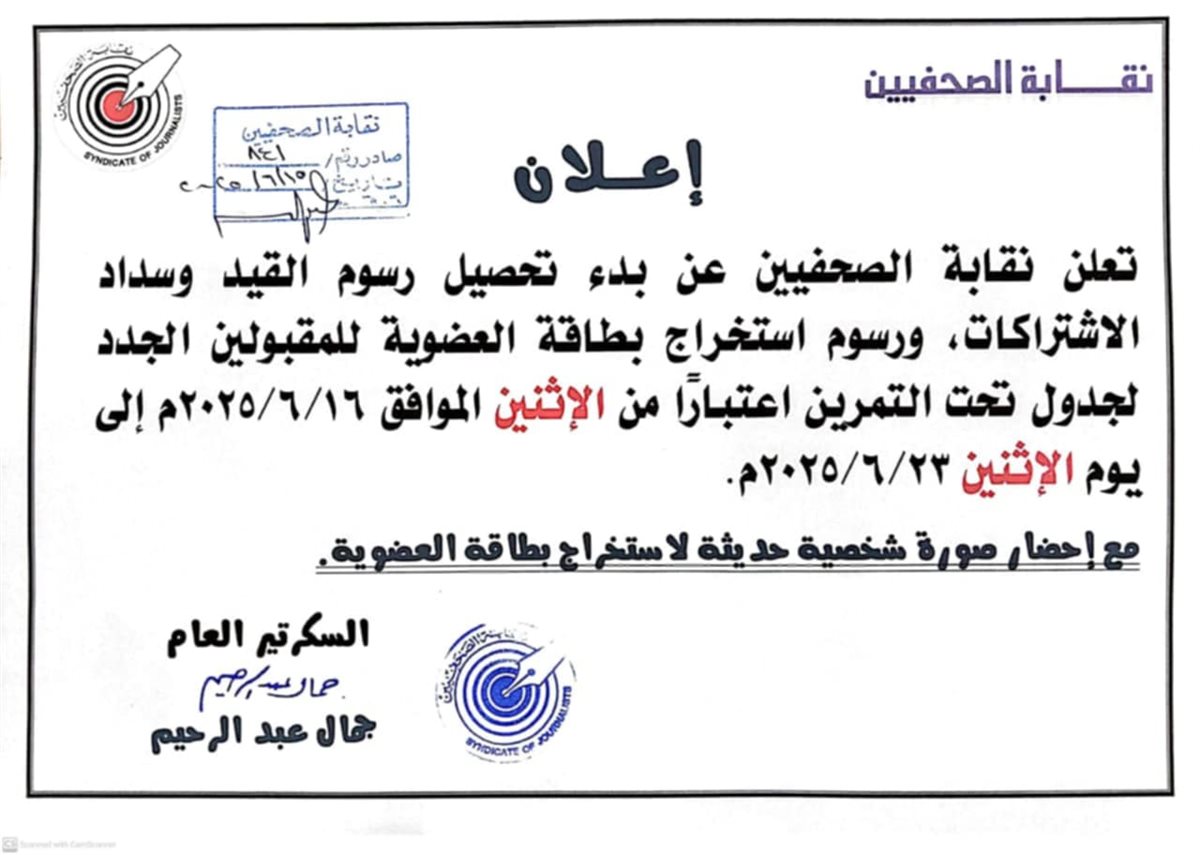 أعلنت نقابة الصحفيين، اليوم الأحد، عن بدء تحصيل رسوم القيد وسداد الاشتراكات، ورسوم استخراج بطاقة العضوية للمقبولين الجدد بجدول تحت التمرين اعتبارًا من الإثنين الموافق 16/6/2025م إلى يوم الإثنين 23/6/2025م.
