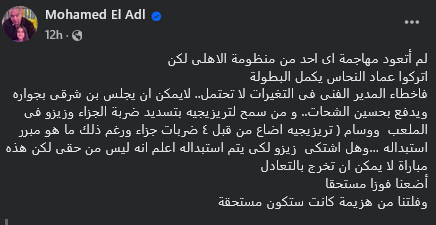 وكتب رئيس قناة الأهلي السابق، عبر حسابه الشخصي على موقع التواصل الاجتماعي فيس بوك، قائلًا: لم أتعود مهاجمة أى أحد من منظومة الأهلى لكن اتركوا عماد النحاس يكمل البطولة.