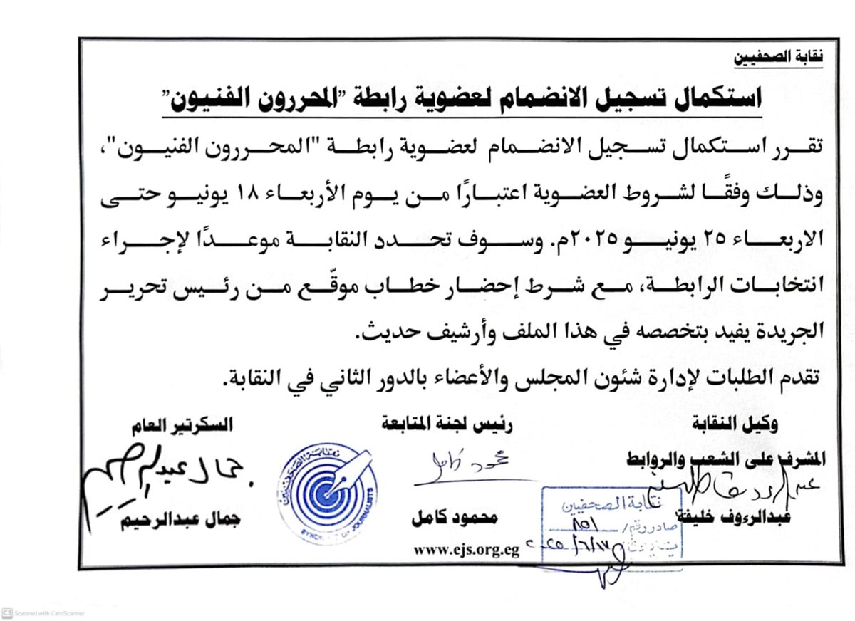قررت نقابة الصحفيين، اليوم الثلاثاء، استكمال تسجيل الانضمام  لعضوية رابطة "المحررون الفنيون"، وذلك وفقًا لشروط العضوية اعتبارًا من يوم الأربعاء 18 يونيو حتى الأربعاء 25 يونيو 2025م.