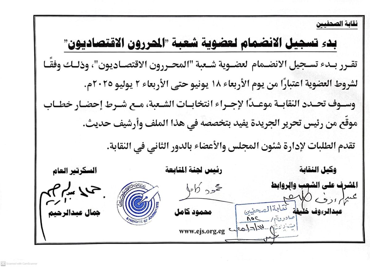 قررت نقابة الصحفيين، اليوم الثلاثاء، بدء تسجيل الانضمام لعضوية شعبة "المحررون الاقتصاديون"، وذلك وفقًا لشروط العضوية اعتبارًا من يوم الأربعاء 18 يونيو حتى الأربعاء 2 يوليو 2025م.