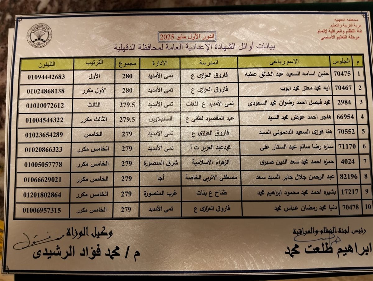 محافظ الدقهلية يعتمد نتيجة الشهادة الإعدادية بنسبة نجاح 90.2%