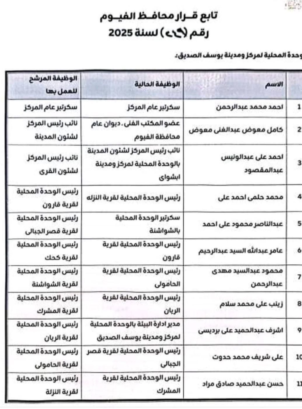 أصدر الدكتور أحمد الأنصاري محافظ الفيوم القرار رقم 249 لسنة 2025 والذي يشمل حركة تنقلات موسعة لرؤساء الوحدات المحلية بقرى مركز يوسف الصديق.
