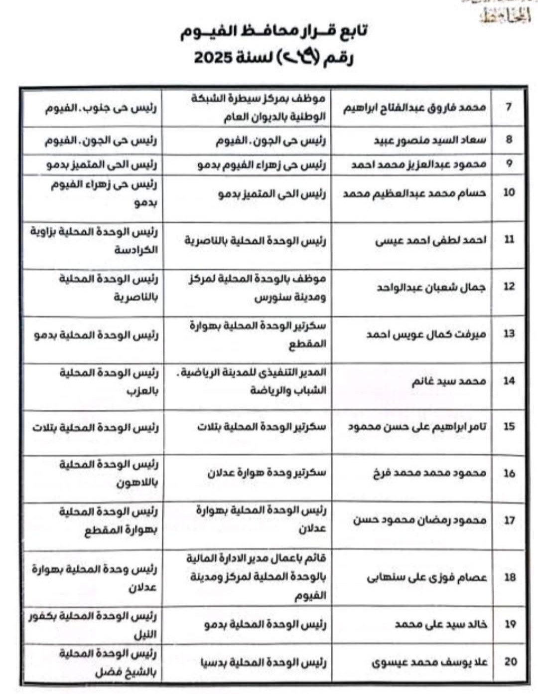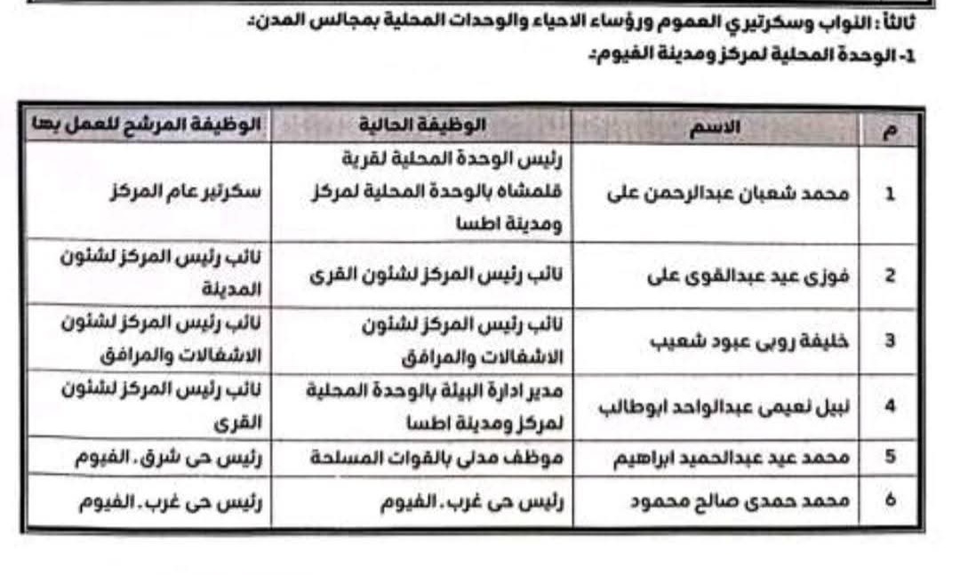تضمن القرار نواب وسكرتيري عموم ورؤساء الأحياء والوحدات المحلية لمركز ومدينة الفيوم، حيث تم ندب المحاسب محمد شعبان عبدالرحمن للعمل سكرتيرًا عامًا للمركز، والمهندس فوزي عبدالقوي علي نائب رئيس المركز لشئون المدينة، والمهندس خليفة روبي عبود نائب رئيس المركز لشئون الإشغالات والمرافق، والمهندس نبيل نعيمي عبدالواحد نائب رئيس المركز لشئون القرى، ومحمد عيد عبدالحميد رئيسًا لحى شرق، ومحمد حمدي صالح رئيسًا لحى غرب الفيوم، ومحمد فاروق عبدالفتاح رئيسًا لحي جنوب الفيوم، وسعاد السيد منصور، رئيسًا لحي الجون، ومحمود عبدالعزيز محمد رئيسًا للحي المتميز بدمو، وحسام عبد العظيم محمد رئيسًا لحي زهراء الفيوم بدمو، وأحمد لطفي أحمد رئيسًا للوحدة المحلية لقرية زاوية الكرادسة، وجمال شعبان عبدالواحد رئيسًا للوحدة المحلية لقرية الناصرية، وميرفت كمال عويس رئيسًا للوحدة المحلية لقرية دمو، ومحمد سيد غانم رئيسًا للوحدة المحلية لقرية العزب، وتامر إبراهيم علي رئيسًا للوحدة المحلية لقرية تلات، ومحمود محمد محمد رئيسًا للوحدة المحلية لقرية اللاهون، ومحمود رمضان محمود رئيسًا للوحدة المحلية لقرية هوارة المقطع، وعصام فوزي علي رئيسًا للوحدة المحلية لقرية هوارة عدلان، وخالد سيد علي رئيسًا للوحدة المحلية لقرية كفور النيل، وعلا يوسف محمد رئيسًا للوحدة المحلية لقرية الشيخ فضل، وأحمد محمد محمد رئيسًا للوحدة المحلية لقرية العدوة، ورحاب جلال محمد رئيسًا للوحدة المحلية لقرية سيلا، وجيهان حمدي أحمد رئيسًا الوحدة المحلية لقرية دسيا.