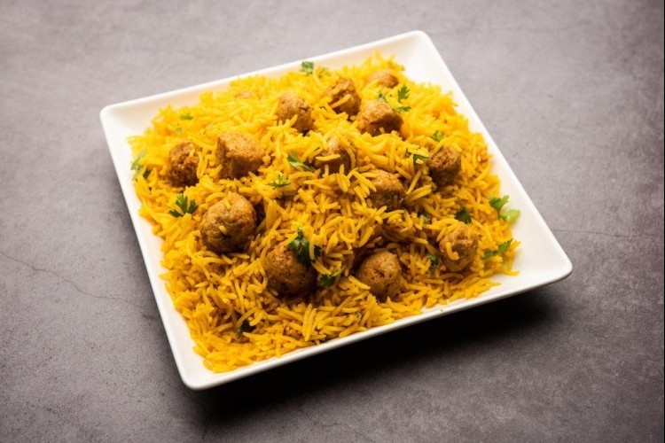 ضعي كفتة اللحمة بالرز البرياني في طبق التقديم، وقدميه ساخناً.