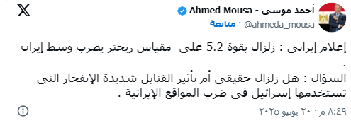 وشكك أحمد موسى في الزلزال، قائلا: «السؤال: هل زلزال حقيقي أم تأثير القنابل شديدة الانفجار التي تستخدمها إسرائيل في ضرب المواقع الإيرانية».