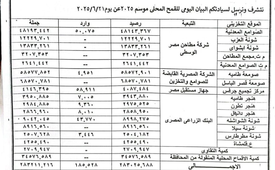 وكانت صوامع الغلال قد بدأت استلام محصول القمح من المزارعين منذ بداية شهر أبريل الماضي، بعدد من الشون والصوامع والهناجر المجهزة لاستقبال المحصول بالقرى والمراكز.