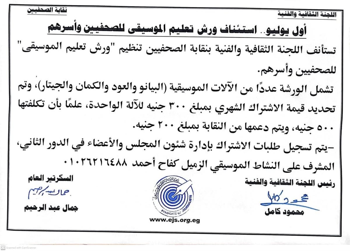 تستأنف اللجنة الثقافية والفنية بنقابة الصحفيين تنظيم "ورش تعليم الموسيقى" للصحفيين وأسرهم.