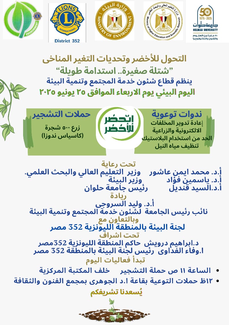 فى إطار المبادرة الرئاسية “اتحضر للأخضر” لتحقيق أهداف التنمية المستدامة ورؤية مصر 2030 من أجل رفع الوعى البيئي بالعديد من القضايا البيئية والتغيرات المناخية والتشجير والتخلص الآمن من المخلفات خصوصًا الإلكترونية، يُنظم قطاع شئون خدمة المجتمع وتنمية البيئة بجامعة حلوان اليوم البيئي فى إطار التحول للأخضر وتحديات التغير المناخي تحت عنوان "شتلة صغيرة ــ استدامة طويلة" وذلك يوم الأربعاء الموافق 25 يونيو 2025