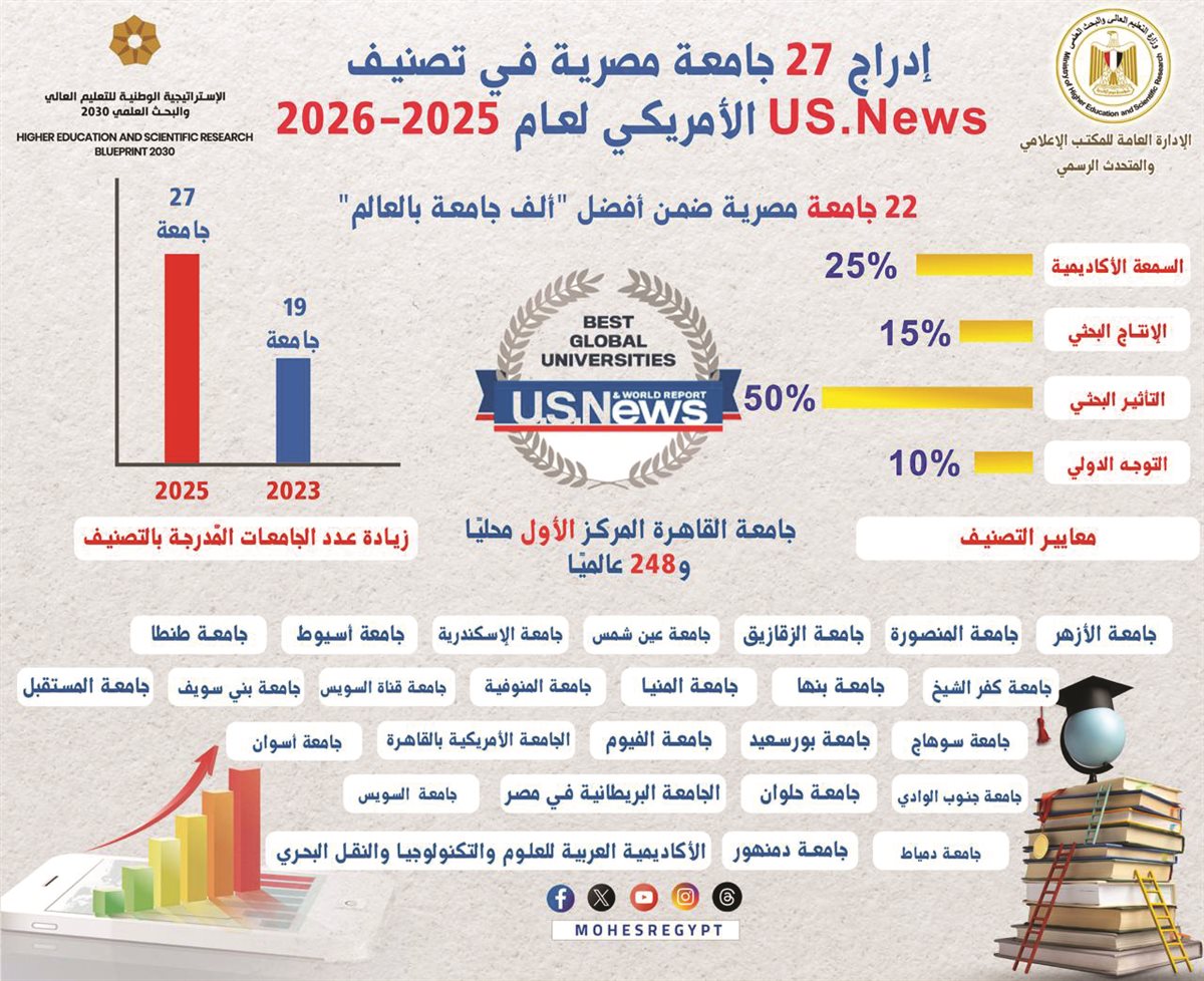 وصرح الدكتور عادل عبدالغفار المستشار الإعلامى والمتحدث الرسمى للوزارة بأن التصنيف أدرج فى نسخته لعام 2025 الجامعات التالية: جامعة القاهرة، جامعة الأزهر، جامعة المنصورة، جامعة الزقازيق، جامعة عين شمس، جامعة الإسكندرية، جامعة أسيوط، جامعة طنطا، جامعة كفر الشيخ، جامعة بنها، جامعة المنيا، جامعة المنوفية، جامعة قناة السويس، جامعة بنى سويف، جامعة المستقبل، جامعة سوهاج، جامعة بورسعيد، جامعة الفيوم، الجامعة الأمريكية بالقاهرة، جامعة أسوان، جامعة جنوب الوادى، جامعة حلوان، جامعة السويس، الجامعة البريطانية فى مصر، جامعة دمياط، جامعة دمنهور، والأكاديمية العربية للعلوم والتكنولوجيا والنقل البحرى.