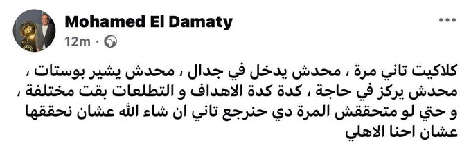 وكتب محمد الدماطي، عبر حسابه الرسمي على موقع التواصل الاجتماعي فيس بوك، عن فشل النادي الأهلي فى تخطي دور المجموعات بكأس العالم للأندية، قائلًا: كلاكيت تاني مرة ، محدش يدخل في جدال ، محدش يشير بوستات ، محدش يركز في حاجة ، كدة كدة الأهداف و التطلعات بقت مختلفة.